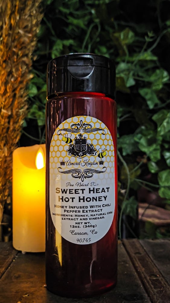 The Armored Kingdom Sweet Heat Hot Honey is the ultimate fusion of 100% pure, raw & unfiltered Midwest Clover Honey and just the right touch of Chili Pepper extract.